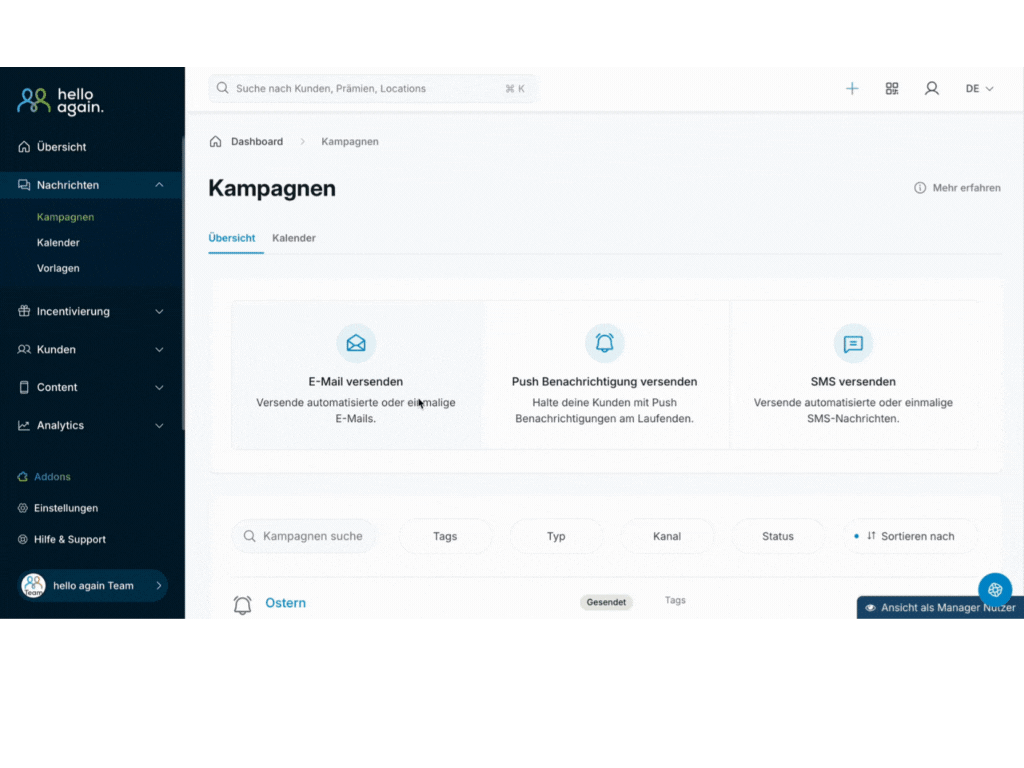All-in-One Lösung im Dashboard: Keine externen Tools nötig – alle Marketingdaten, Kampagnen & Kontakte steuerst du zentral im hello again Dashboard.