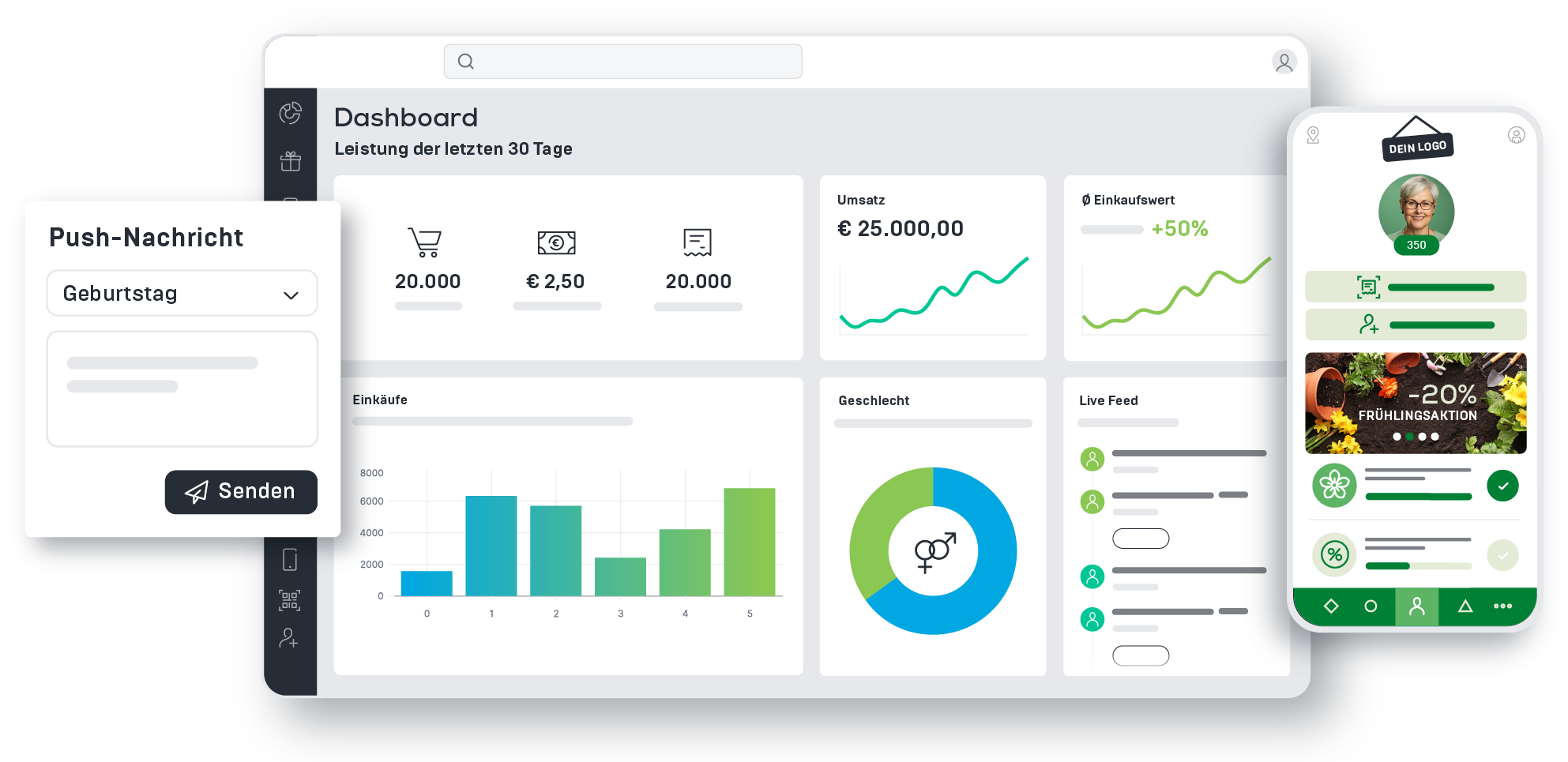 Unsere Lösung besteht aus einer App und einem CRM-System (Dashboard). Diese Kombination aus individualisierter App für deine treuen Kund:innen und dem dahinterliegenden CRM-System samt Dashboard für dich als Unternehmen sorgt für einen einzigartigen Mehrwert – und macht die Kundenansprache so einfach wie nie zuvor.