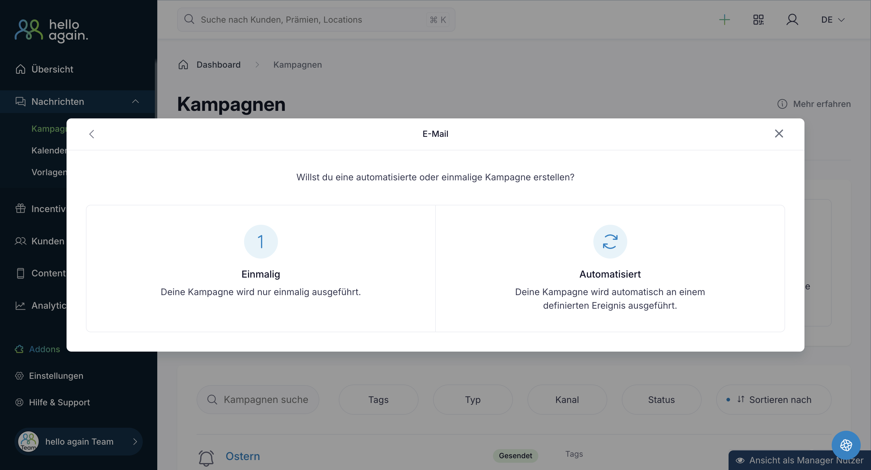 Mit hello again brauchst du kein zusätzliches Newsletter-Tool. Du erstellst, planst und versendest deine E-Mail-Kampagnen ganz bequem im Dashboard – einfach, übersichtlich und genau auf deine Zielgruppe abgestimmt.