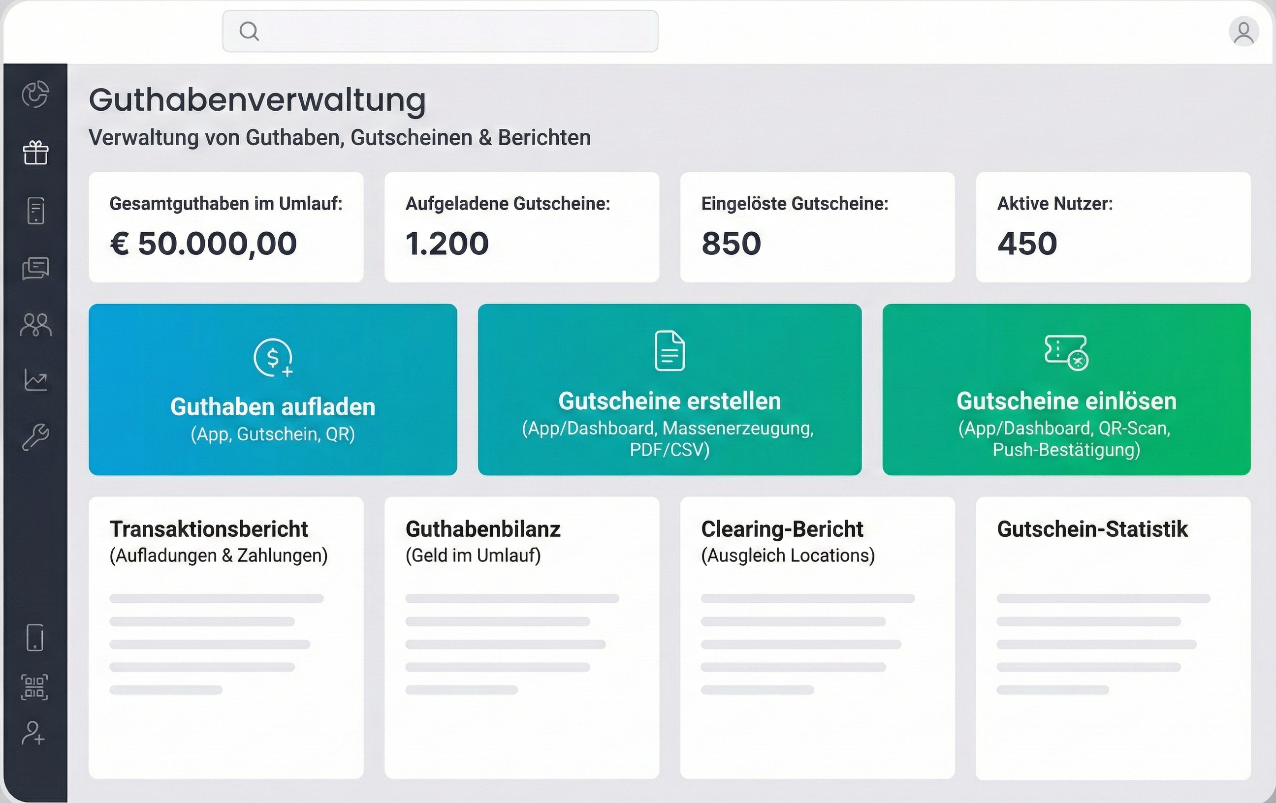 Die Verwaltung erfolgt über das Dashboard oder direkt in der App. Guthaben kann aufgeladen, übertragen oder eingelöst werden – alles mit wenigen Klicks und voller Übersicht.